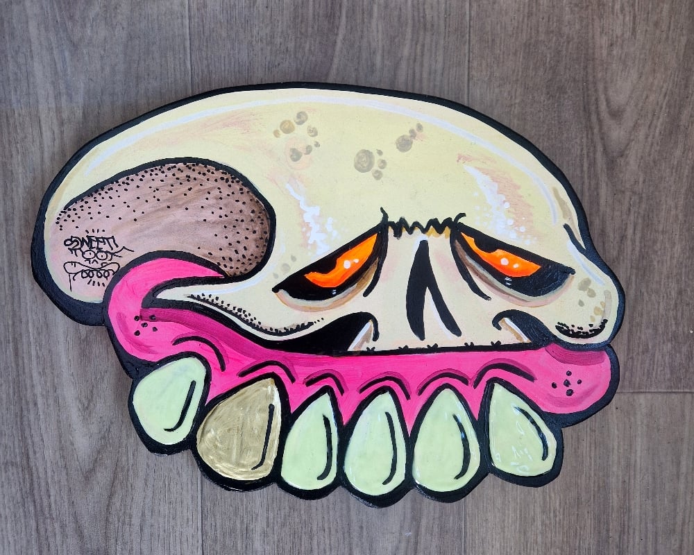 With heavy impasto glow in the dark teeth and gold bling