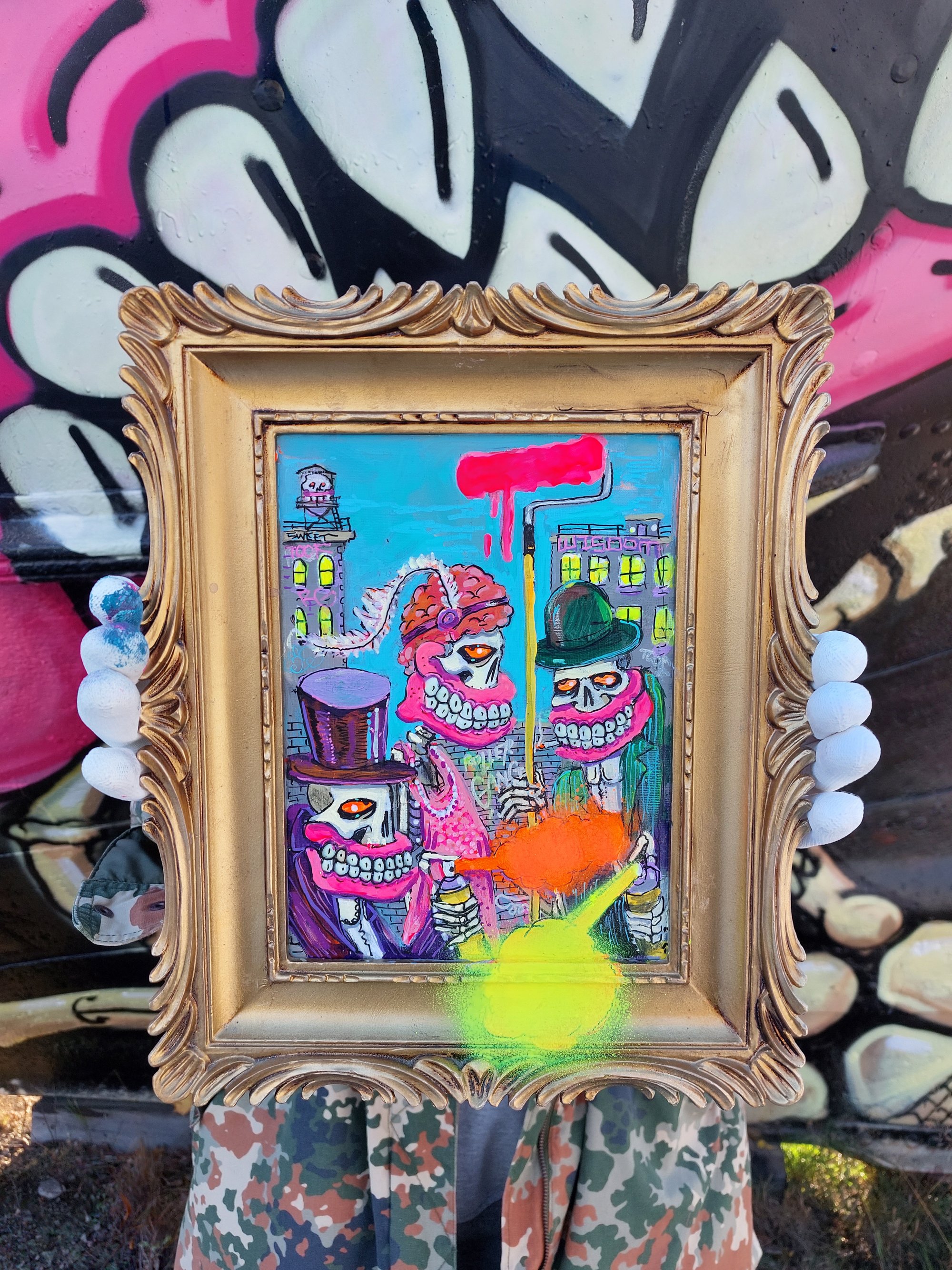 Original Framed mobster's Acrylic enamel and spraypaint With glow in the dark teeth Signed on reverse 34 x 28 cm