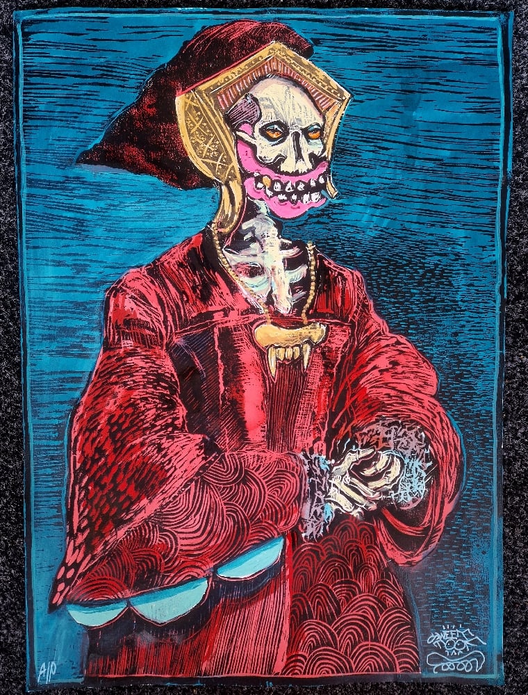 Hand embellished WoodcutAcrylic, enamel and ink washSomerset paper150gsm70 x 50 cmSigned