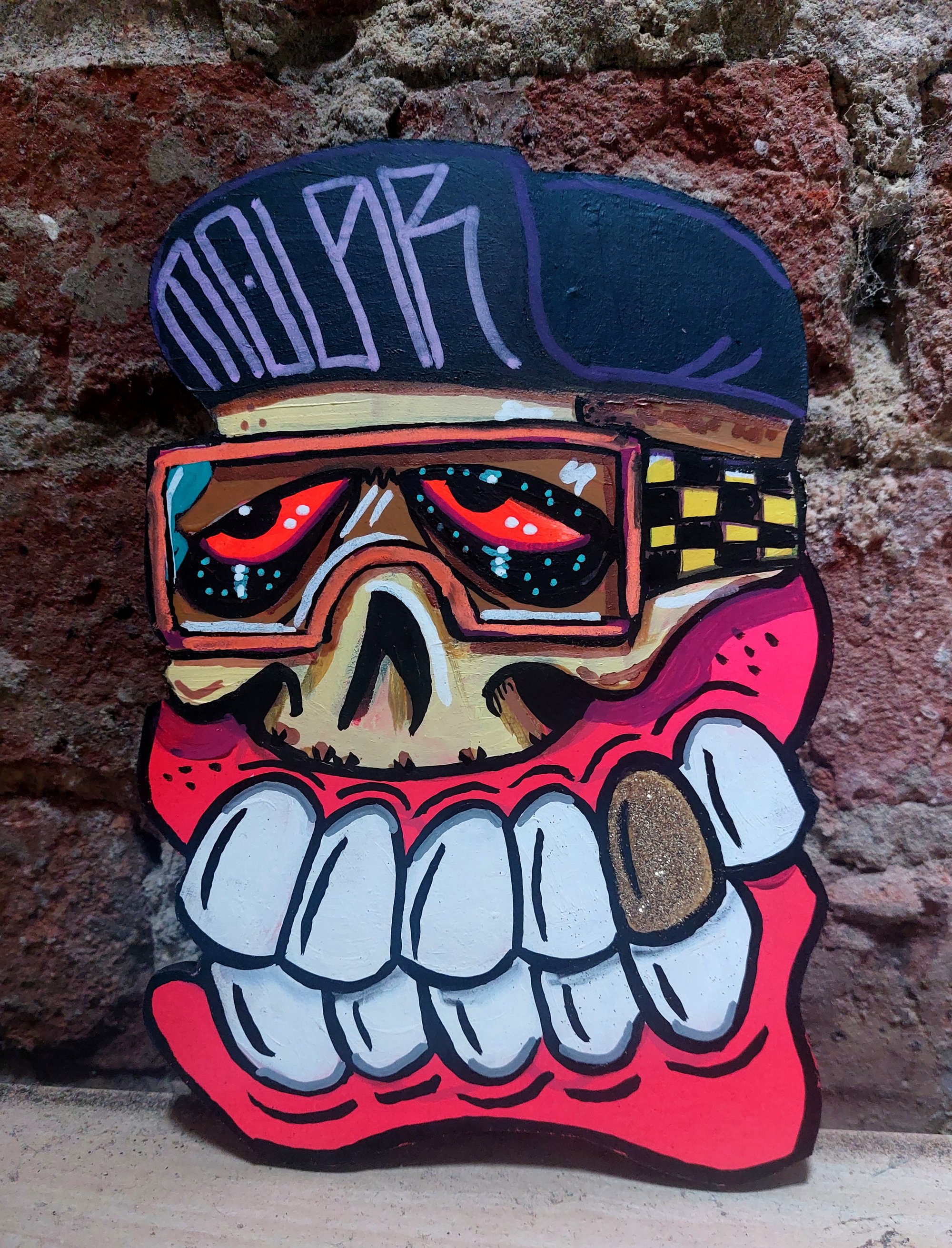 Original Molar Skull Wooden cutout Acrylic enamel & spraypaint With gold Bling Signed on reverse 22 x 15 cm