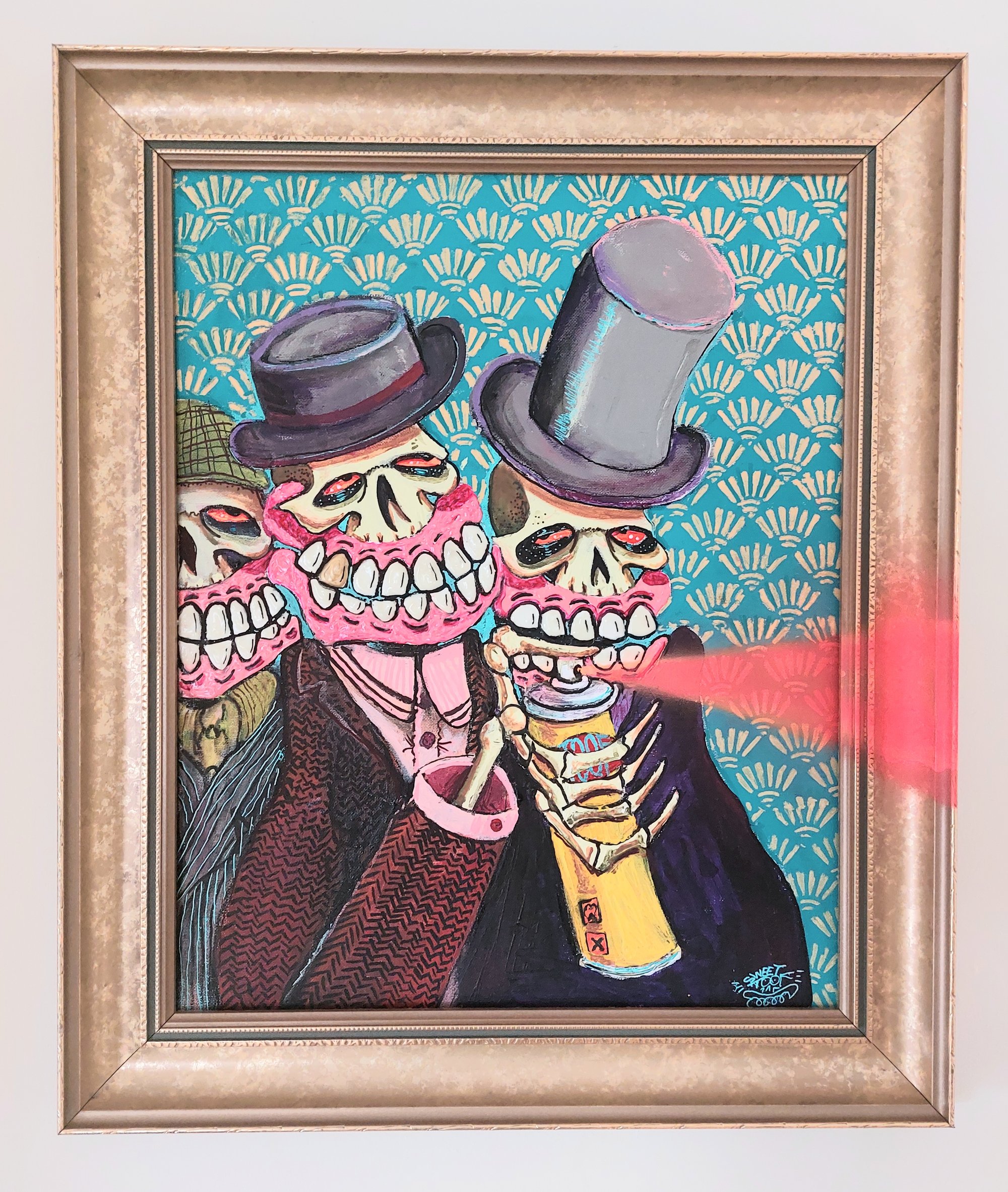 Original Framed canvas panel Acrylic enamel & spraypaint With impasto Glow in the dark teeth & gums 61 x 52 cm