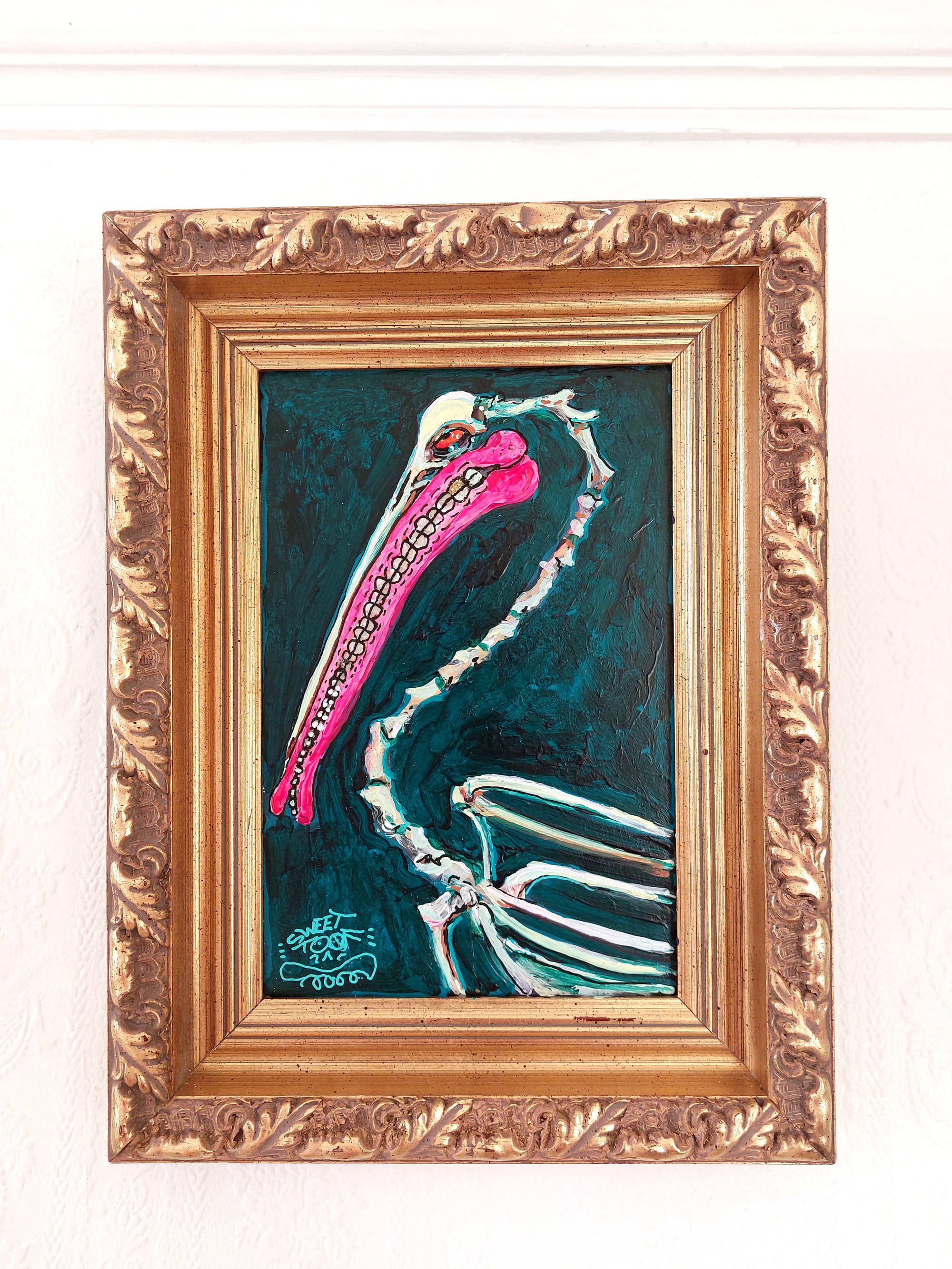 Original Pelican bones Framed Acrylic and enamel With impasto glow in the dark teeth and gums Signed 34 x 26 cm