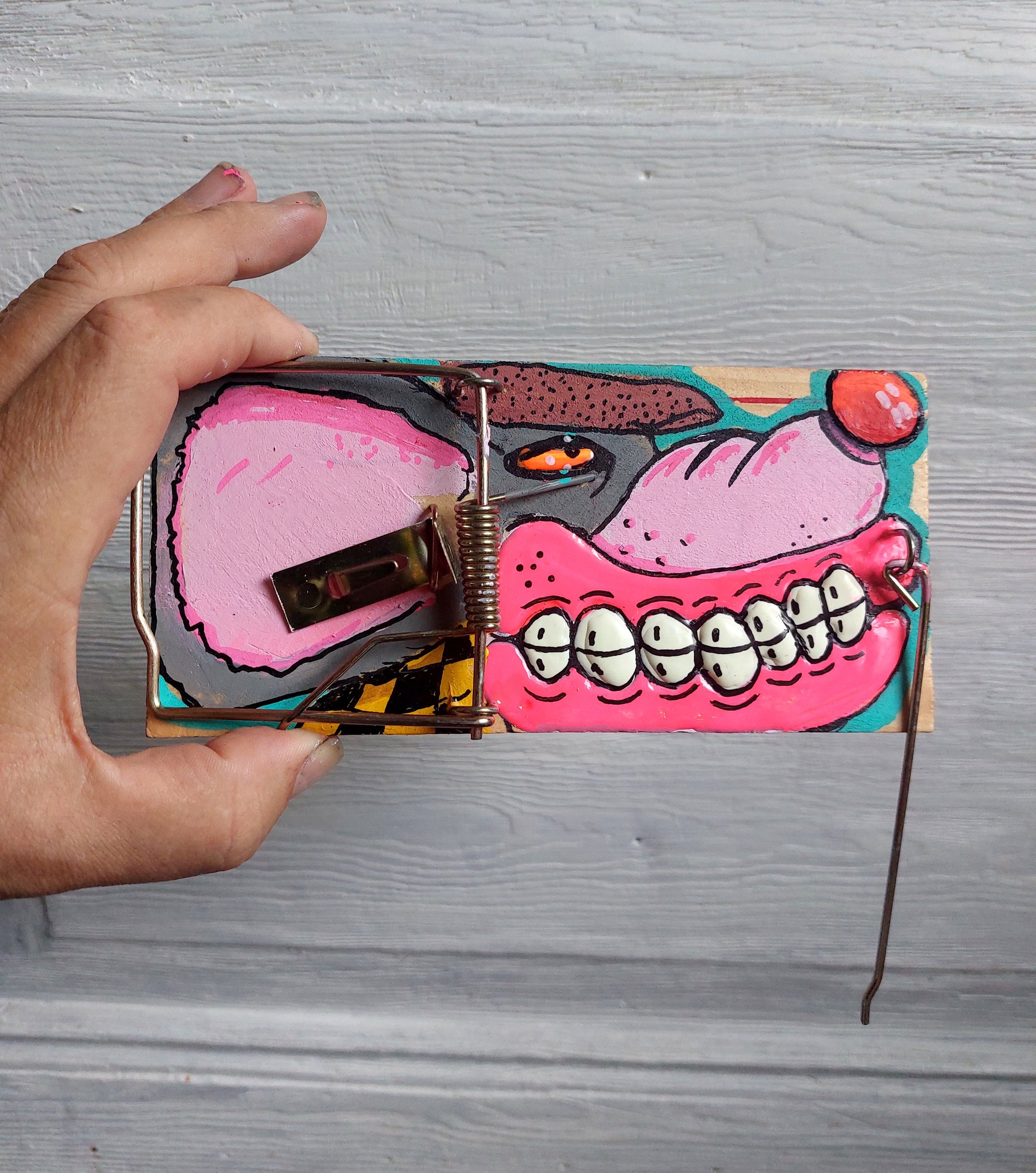 Original Acrylic enamel With impasto gums and teeth Painted wooden Rat Trap 17 x 8 cm Signed on reverse
