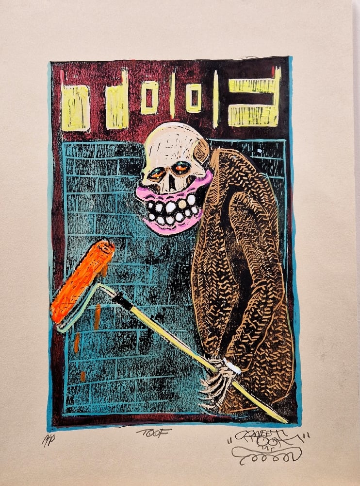 Roller Toof Hand embellished Linocut Acrylic and ink wash With gold bling 250 Gsm Fontaine paper 39 x 29 cm Signed