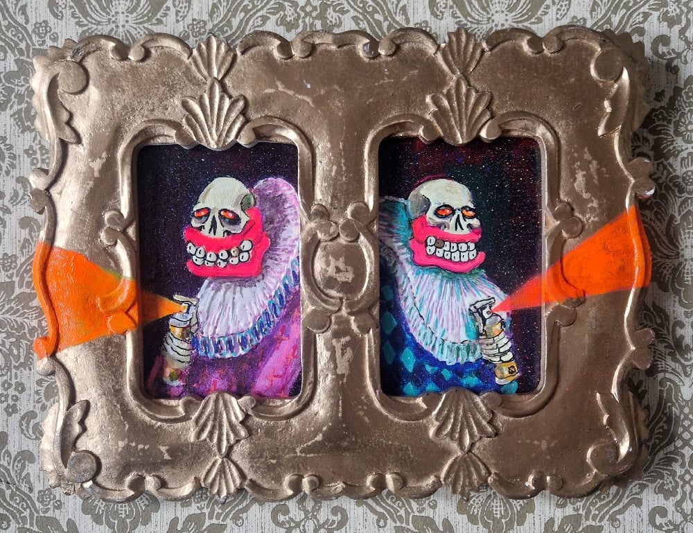 Original Framed Ruffneck Duo 2 x canvas panels Acrylic enamel and spraypaint With gold bling Impasto gums and teeth Signed on reverse 32 x 25 cm