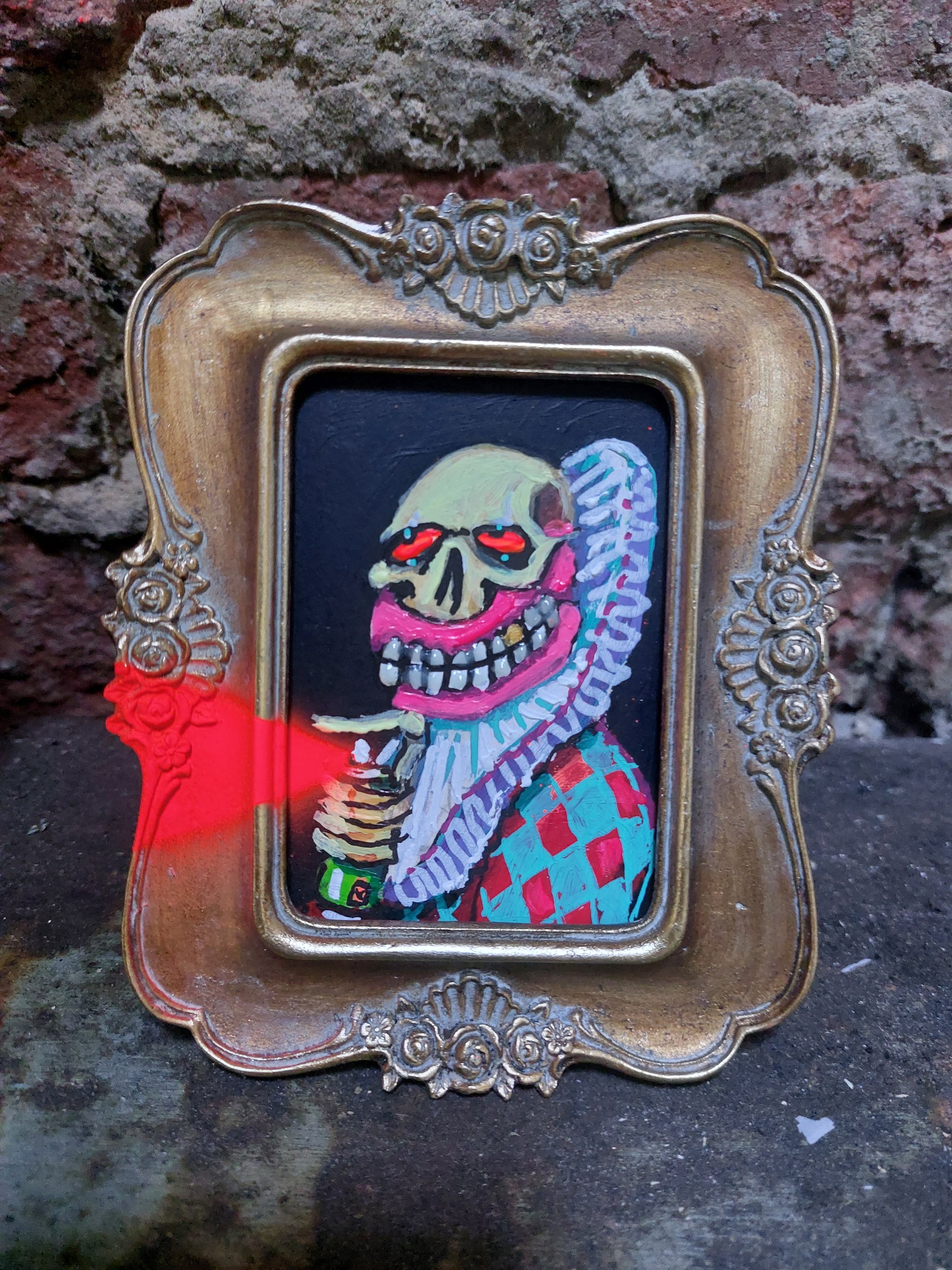 Original Framed Ruffneck Acrylic enamel and spraypaint With glow in the dark teeth Sighed on reverse 14 x 11 cm