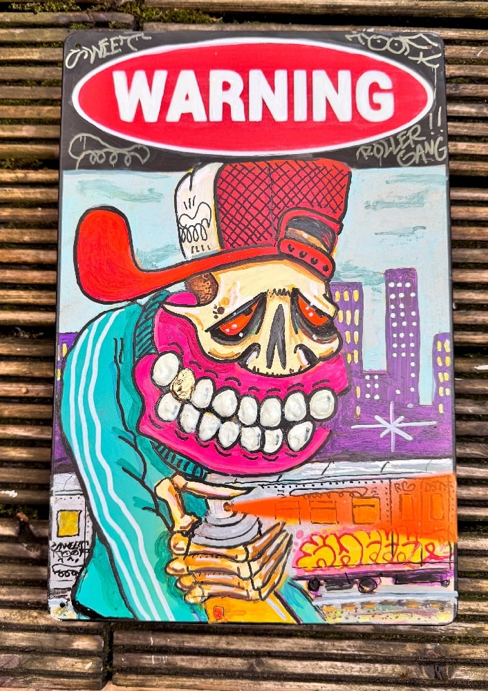 Original Painted Warning Acrylic enamel and spraypaint With glow in the dark teeth and gold bling Metal sign 30 x 20