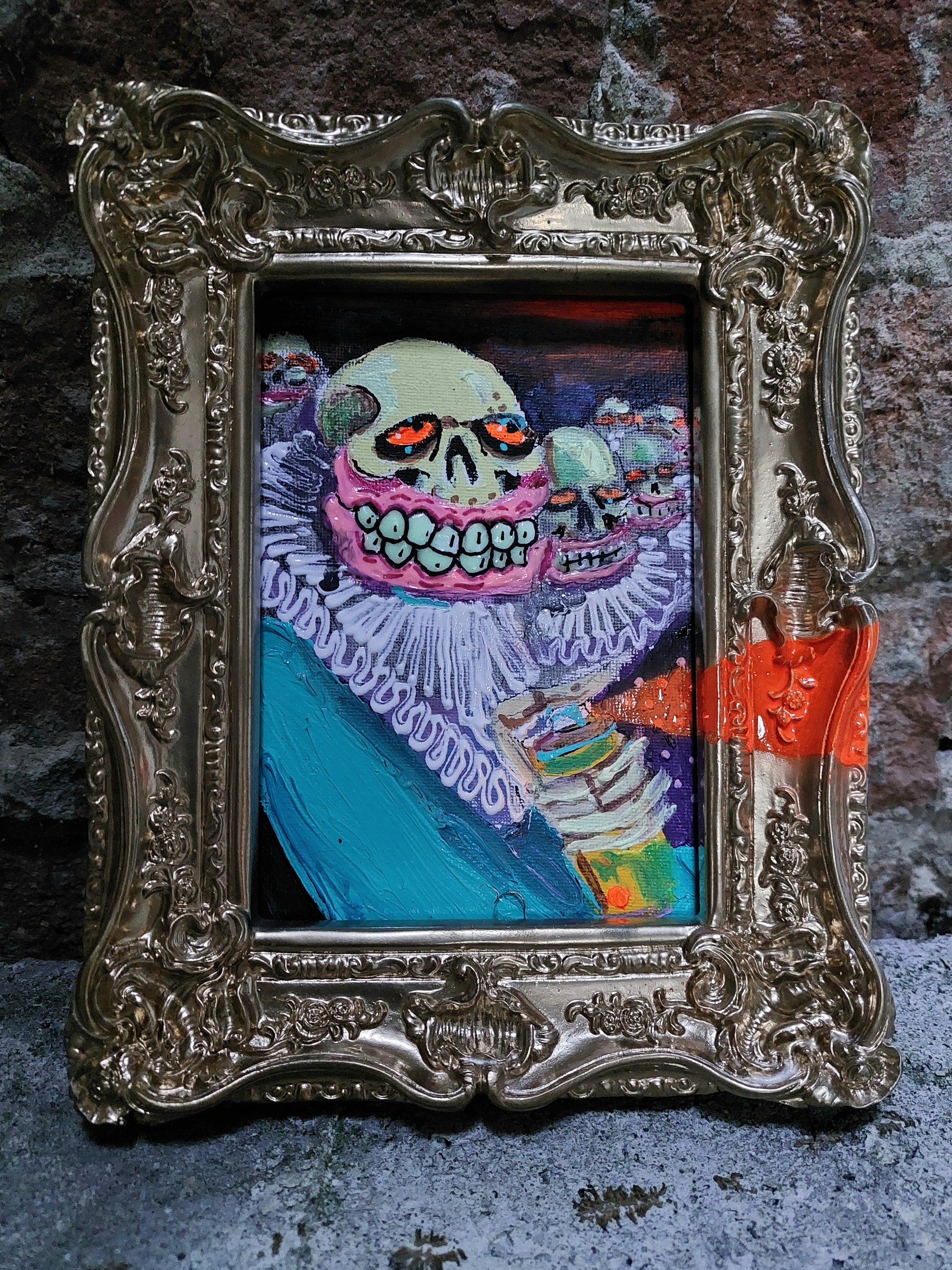 Original Canvas panel Framed Ruffneck Acrylic enamel and spraypaint With impasto glow in the dark teeth Signed on reverse 23 x 19 cm