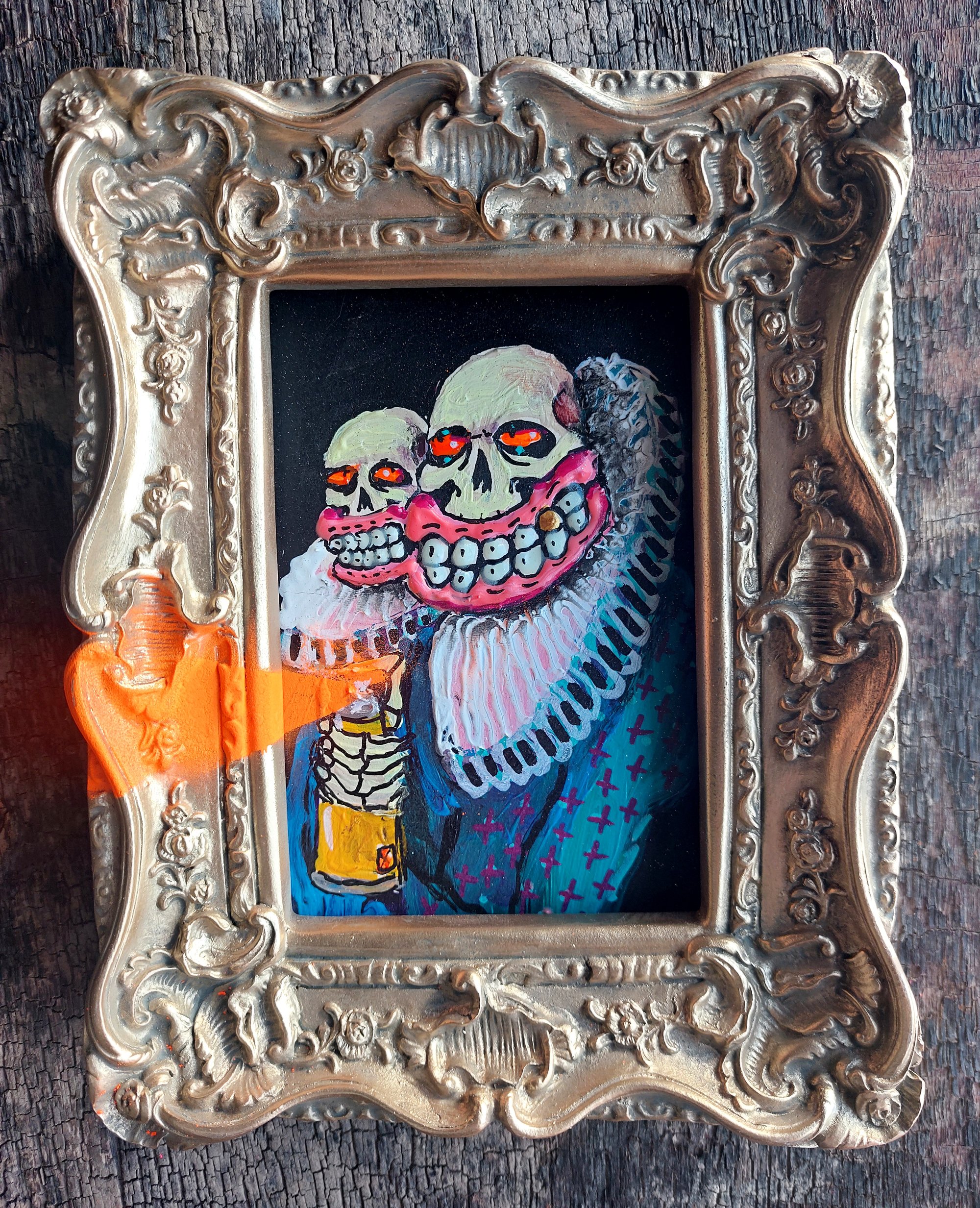 Original Framed Ruffneck acrylic enamel and spraypaint With glow in the dark teeth and gums Signed on reverse 20 x 16 cm Signed on reverse