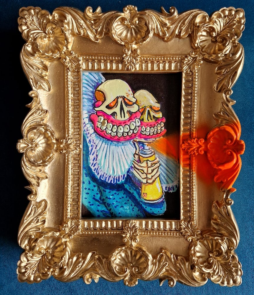 Original Framed Ruffneck Acrylic enamel and spraypaint With glow in the dark teeth and gold bling Canvas panel 26 x 22 cm Signed on reverse