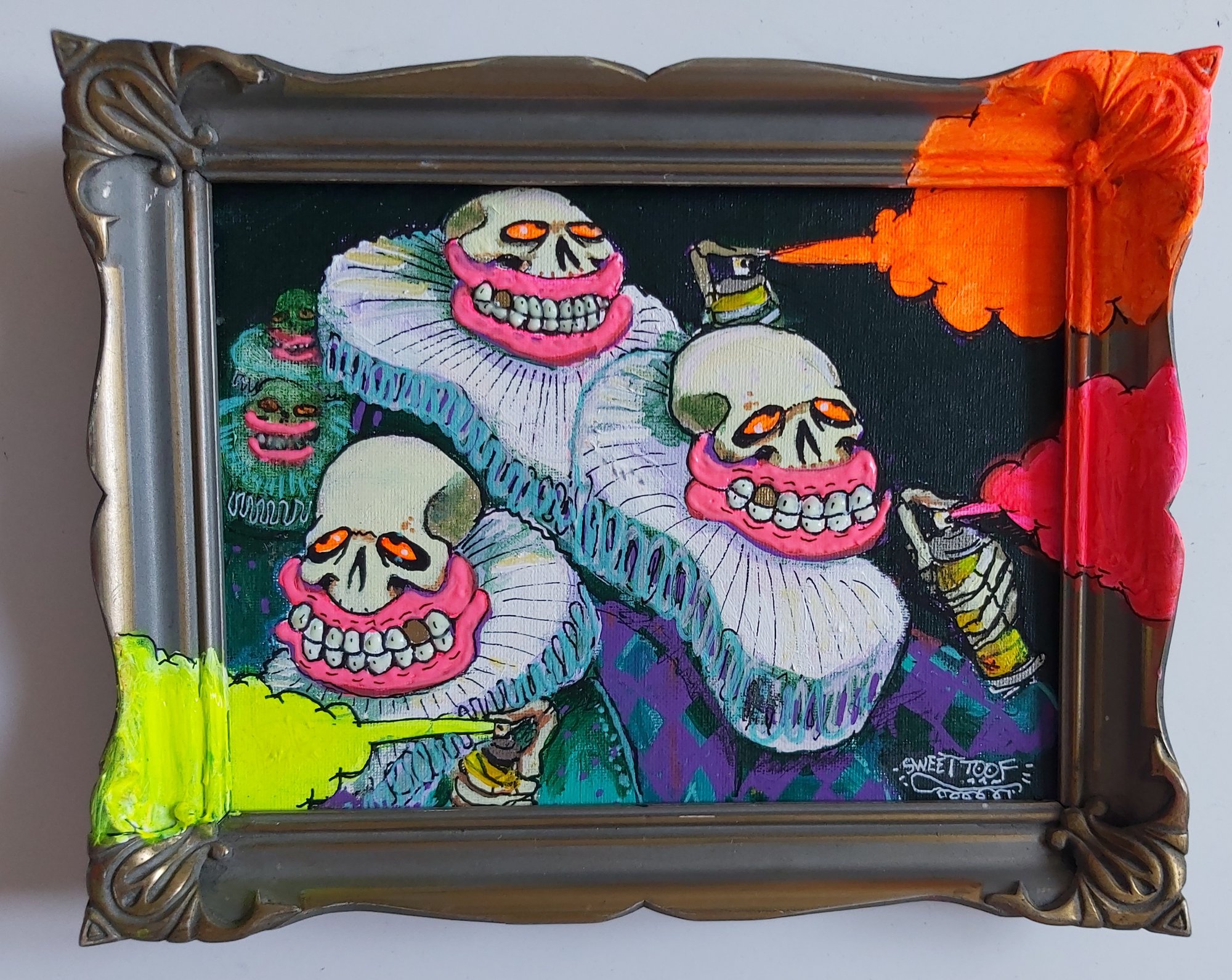 Original Acrylic and enamel with glow in the dark teeth Ruff Neck canvas panel Vintage painted frame frame 29 x 23 cm Signed