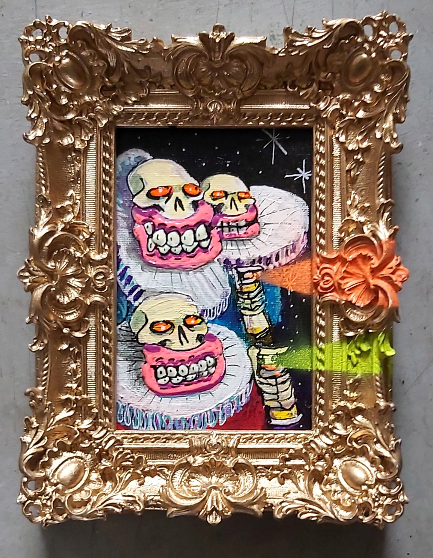 Original Framed Ruffneck Acrylic enamel and spraypaint With glow in the dark teeth Signed on reverse 22x 16 cm